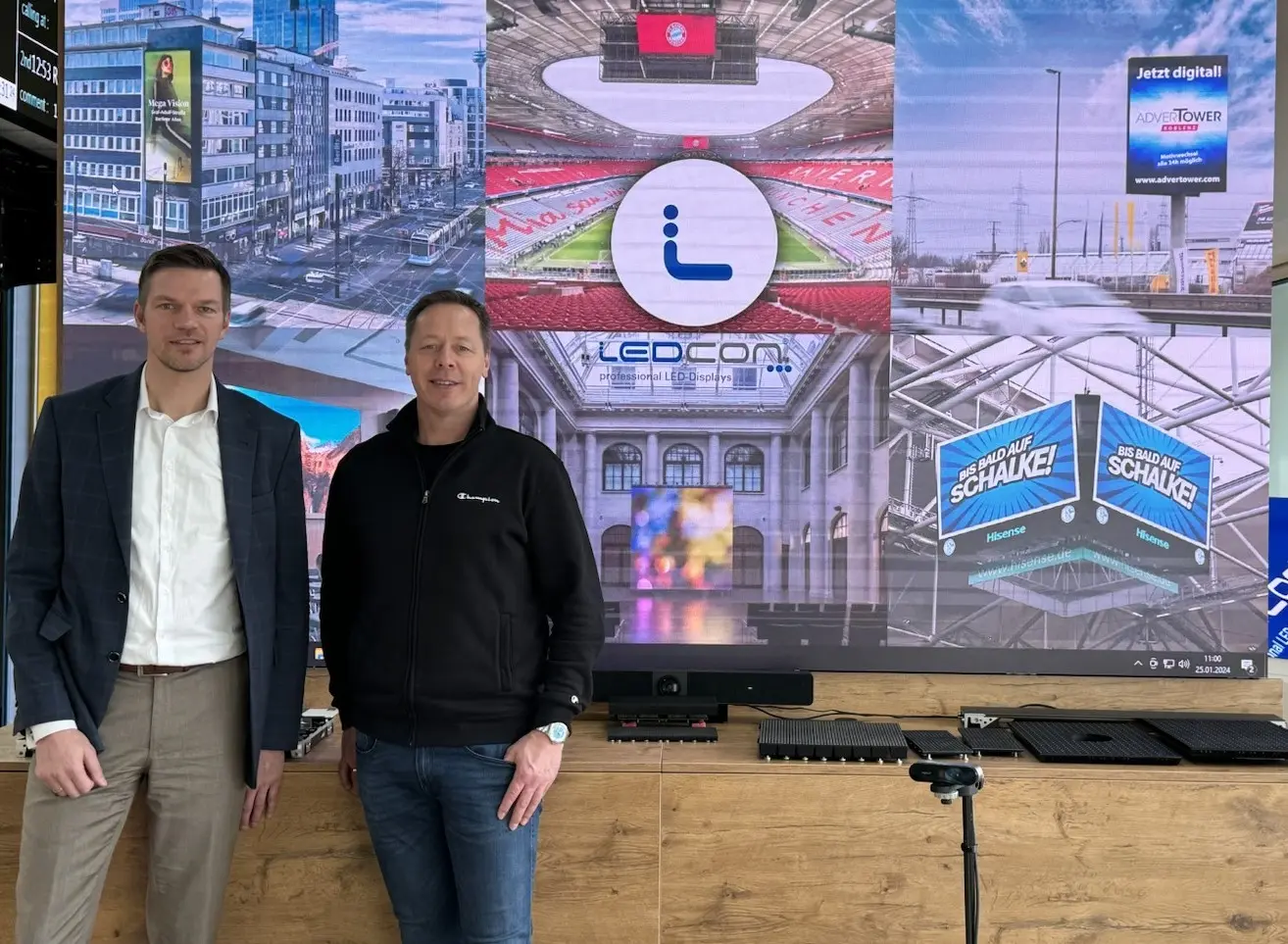 mit einer Auswahl an Referenzprodukten im Hintergrund – natürlich auf LED-Display präsentiert