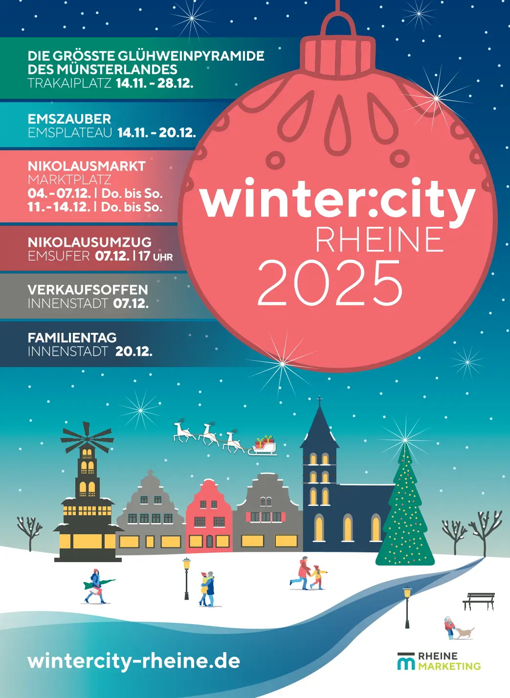 Vom 14. November bis 28. Dezember 2025 verwandelt sich Rheines Innenstadt erneut in ein stimmungsvolles Winterwunderland mit Glühweinpyramide, Nikolausmarkt und vielen Highlights.