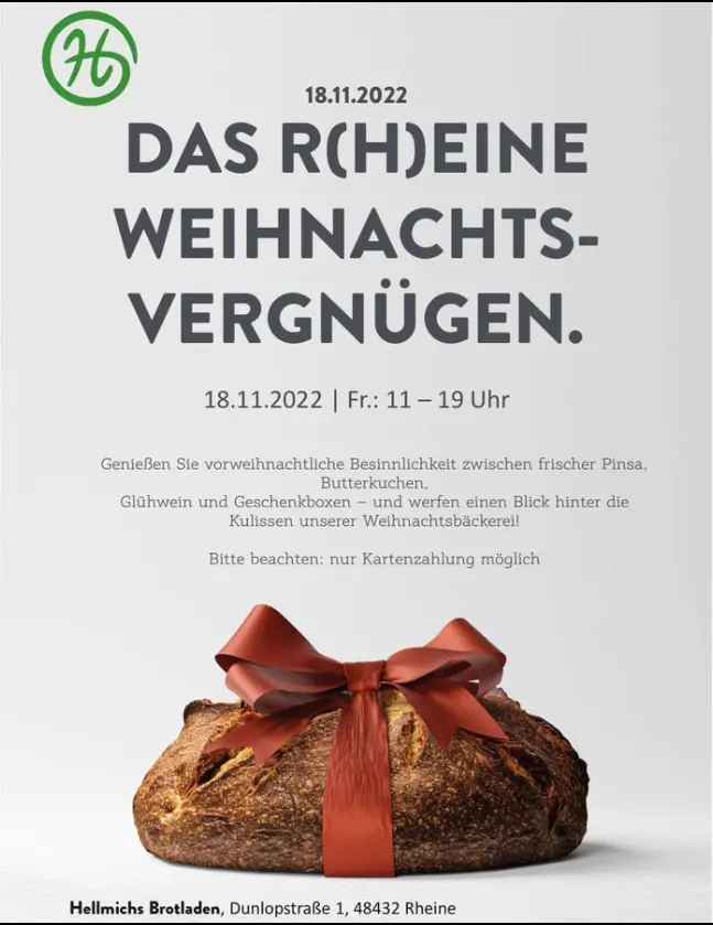 Hellmichs Brotladen Dunlopstr. 1, Rheine, NRW, GermanyAlle Jahre wieder…. Wir freuen uns Euch am 18.11 bei uns im Brotladen willkommen zu heißen ☺️ Genießen Sie vorweihnachtliche Besinnlichkeit zwischen frischer Pinsa, Butterkuchen, Glühwein und Geschenkboxen... und werfen einen Blick hinter die Kulissen [...]
