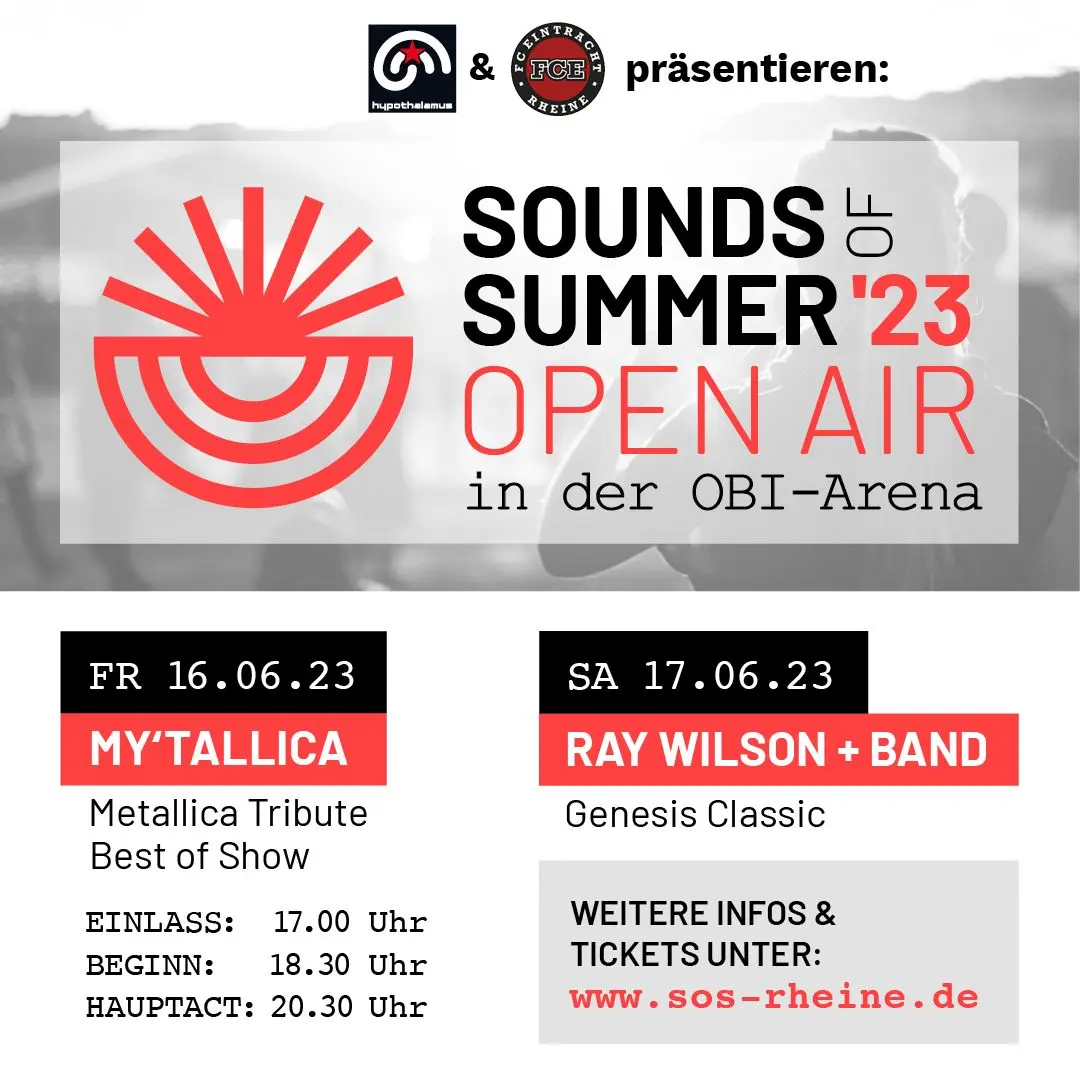 OBI-Arena Bentlager Weg 40, Rheine, NRWSOS steht in Rheine für SOUNDS OF SUMMER! Der FCE und das hypothalamus präsentieren zum zweiten Mal gemeinsam das 2-tägige Open Air: SOUNDS OF SUMMER in der Obi-Arena! Ab 18:30 Uhr spielt die Megadeth [...]